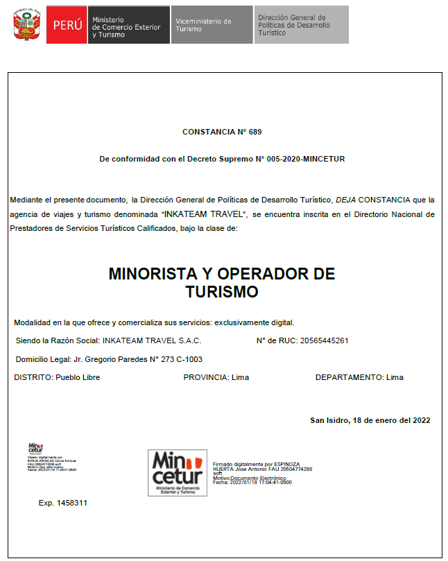 Inkateam Travel SAC es una agencia de viajes Inscrita al Directorio Nacional de Prestadores Turísticos Calificados.